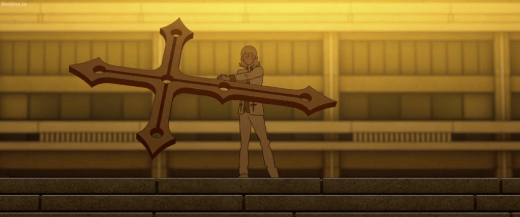On to Fight Two: Episode. OK…. Another weird name but let’s go with it again. What’s the stick going to be this time? Oh. He’s a half vampire, half human. Uhuh, OK. And he carries a huge crucifix for some reason. OK, let’s see where this goes. And he hates vampires and resents his vampire half but cannot integrate with the other humans as he’s half-vampire. Oh, the agony!